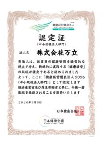 健康経営優良法人認定制度とは、特に優良な健康経営を実践している大企業や中小企業等の法人を「見える化」することで、従業員や求職者、関係企業や金融機関などから評価を受けることができる環境を整備することを目的に、2016年度に経済産業省が創設した制度です。健康・医療新産業協議会健康投資ワーキンググループ(日本健康会議健康経営・健康宣言10万社WG合同開催)において定められた評価基準に基づき、日本健康会議が「健康経営優良法人」を認定します。万立は連続4年目の認定です。